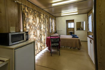 Cabin 1 has an ensuite shower & toilet. 1 double bed. Basic cooking includes, microwave, small fridge, electric fry pan, crockery. TV & air conditioning.